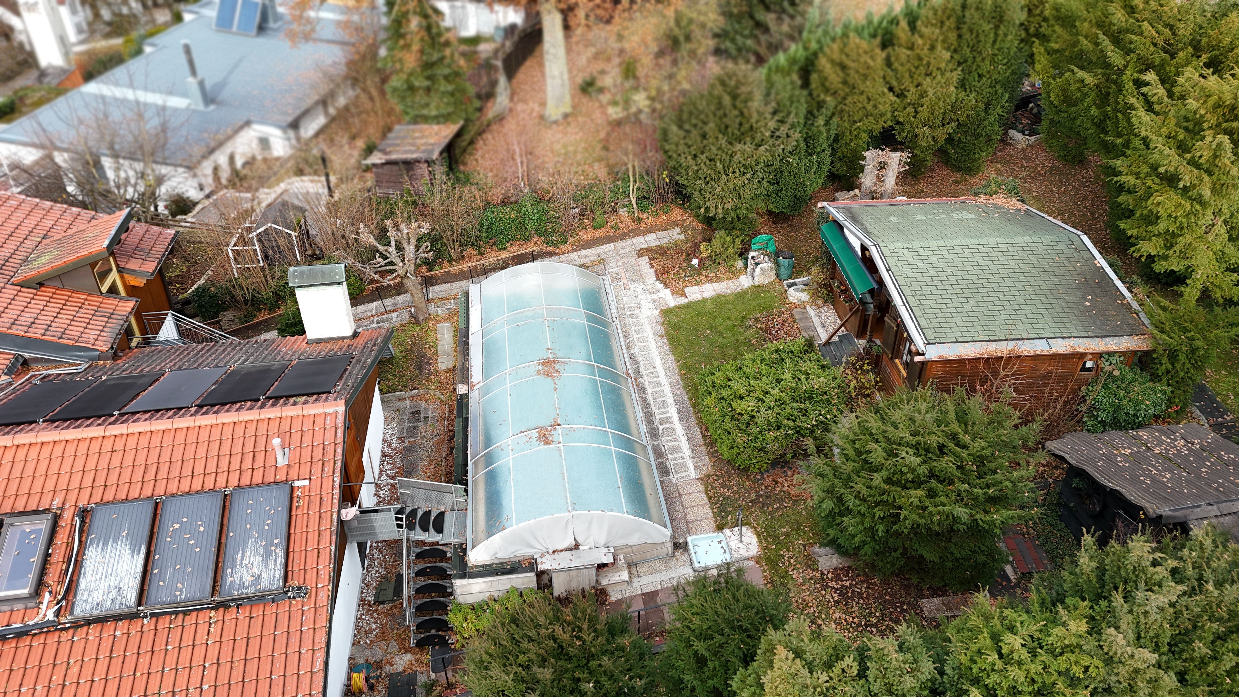 Auch im Außenbereich eröffnen sich dank des in etwa 600 m² großen, uneinsehbaren Gartens auf der Südseite inklusive einer rustikalen Holzblockhütte unbegrenzte Möglichkeiten für ein gemütliches Beisammensein im Grünen oder erholsame Stunden in der Natur.