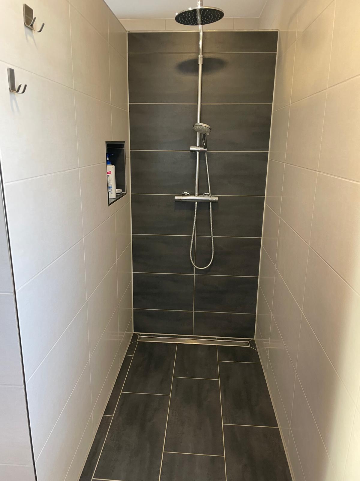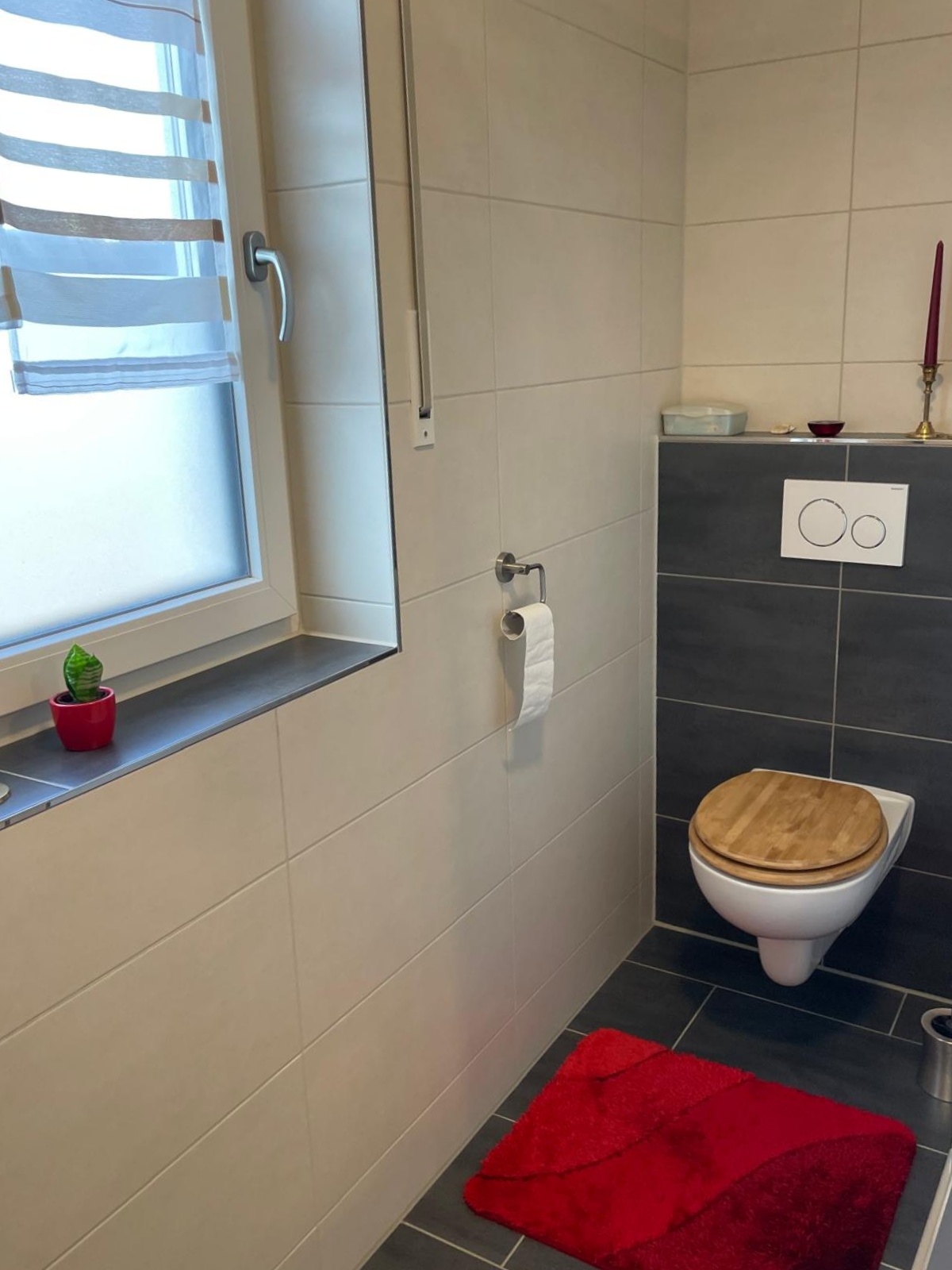 Über eine Betontreppe mit Echtholzverkleidung gelangen Sie in das Obergeschoss, in welchem Sie das Badezimmer, mit gemauerter, bodengleicher Dusche, Badewanne, sowie einem Fenster begrüßt.